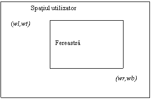 In concluzie, fereastra specifica zona de date care trebuie vizualizata pe un suport grafic. Coordonatele diferitelor puncte din interiorul ferestrei sunt coordonate utilizator sau coordonate reale si vor fi cuprinse intre wl si wr respectiv wt si wb.