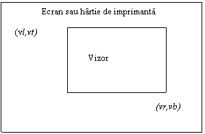 Rezulta deci ca vizorul este portiunea din suportul grafic unde va fi proiectata fereastra. Valoarea maxima pentru parametrii vl,vt,vr,vb depinde de tipul de monitor sau imprimanta folosita. Coordonatele punctele din interiorul vizorului sunt coordonatele Ecran si vor fi cuprinse intre vl si vr respectiv vt si vb.