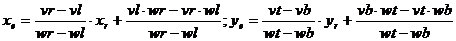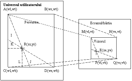 Trecerea de la coordonate-utilizator la coordonate ecran. Pentru a obtine reprezentarea unei ferestre (wl,wt,wr,wb) intr-un vizor (vl,vt,vr,vb) trebuie cunoscute formulele matematice care ne permit sa calculam coordonatele ecran (xe,ye) ale oricarui punct de coordonate reale (xr,yr) din fereastra (fig 3). formulele folosite pentru transformarea coordonatelor utilizator in coordonate ecran se bazeaza pe conservarea proportiilor si sunt urmatoarele: