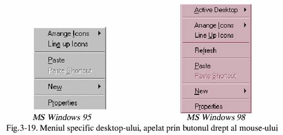 Butonul din dreapta al mouse-ului se poate utiliza pentru a accesa proprietatile obiectului respectiv. Pozitionand cursorul mouse-ului pe oricare dintre obiectele dispuse pe desktop si efectuand un click cu butonul din dreapta al mouse-ului este afisat un meniu, ale carui optiuni sunt selectate cu un click din butonul din stanga.