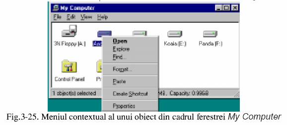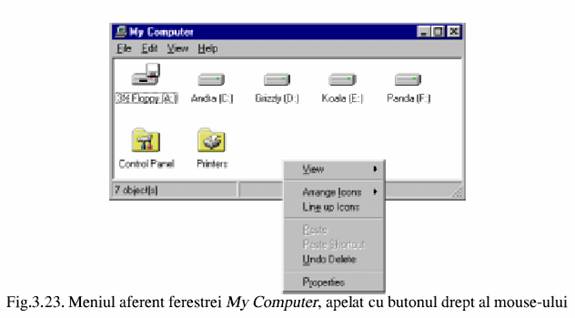 Exercitiu 3-15: Deschideti aplicatia My Computer. Pozitionati cursorul mouse-ului in interiorul ferestrei si efectuati click cu butonul din dreapta al mouse-ului.
