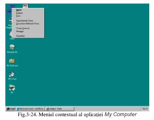 Exercitiu 3-16: Inchideti fereastra My Computer. Pozitionati cursorul mouse-ului pe icon-ul My Computer de pe desktop si apasati butonul din dreapta al mouse-ului. Va fi afisat un meniu similar cu cel din figura 3-24: