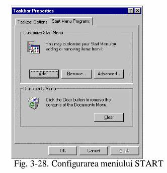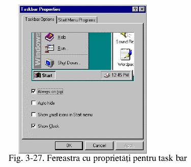 Exercitiu 3-20: Afisati fereastra cu proprietati pentru task bar. Lasati activate numai urmatoarele optiuni: