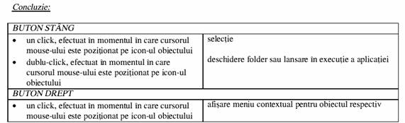 Pana in acest moment a fost utilizat in principal butonul din stanga al mouse-ului, care permite pozitionarea cursorului pe ecran, selectia diferitelor obiecte printr-un click, lansarea in executie a programelor prin dublu-click, dimensionarea si deplasarea obiectelor prin tehnica drag and drop.