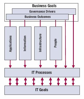 Organizarea IT ofera, fata de aceste scopuri, un set clar definit de procese care utilizeaza abilitatile oamenilor si infrastructura tehnologiei pentru a opera aplicatii de proces automate in timp ce se utilizeaza informatiile de afaceri. Aceste resurse, impreuna cu procesele, constituie o arhitectura a intreprinderii pentru IT. Pentru a raspunde cerintelor de afaceri pentru IT, intreprinderea trebuie sa investeasca in resursele necesare pentru a crea o capacitate tehnica adecvata (ex. un sistem de planificare a resurselor in intreprindere) pentru a sprijini capacitatea afacerilor (ex. implementarea unui lant de furnizare) care sa dea rezultatul dorit (ex. beneficii financiare si crestere a anzarilor).