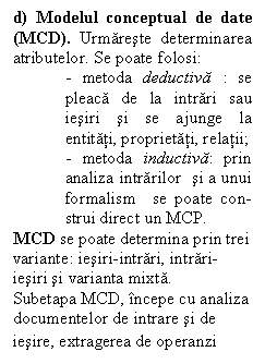 Pentru detalierea conceptelor specifice fiecarei etape din tabel, in continuare se fac referiri la fiecare etapa a metodei Merise (exemple de aplicare a acestei teorii se pot vedea in lucrarile de laborator 9-11 din "Laborator si ghid interactiv pentru proiectarea sistemelor informatice" unde se prezinta cazul unei case de schimb valutar):