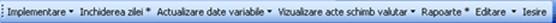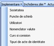 Inceputul zilei se face din submeniul "Actualizare date variabile" si consta in introducerea cursului leului ca si a celorlalte valute in raport cu valuta de referinta conform BNR (folosind optiunea Curs la CSV care deschide formularul nomenclator valuta) si in introducerea ratei de vanzare-cumparare in lei grei a valutei de referinta. In continuare, pe baza acestor date, daca se apasa butonul Calculez si stochez automat ratele de schimb pt. toate valutele active din formularul nomenclator valuta, se face calculul automat al ratei de schimb la cumparare si vanzare in lei, pentru fiecare valuta. Tot acum, cu optiunea Curs si comision care deschide formularul Curs BNR si comision, se poate schimba comisionul pentru cumparare si vanzare de valuta.
