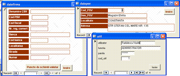 In continuare sunt prezentate imagini ale formularelor ce trebuie completate pentru fiecare din aceste optiuni. Este vorba de formularul date firma, aferent optiunii Societatea, formularul datepsv folsit de optiunea Puncte de schimb si de formularul Util folosit pentru introducerea datelor despre utilizatori.