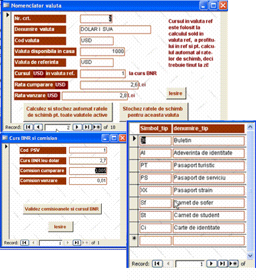 In continuare sunt prezentate formularele aferente optiunilor nomenclator valute, curs si comision si tipuri de acte de identitate. Este vorba de formularul nomenclator valuta, curs BNR si comision, precum si formularul ActId.