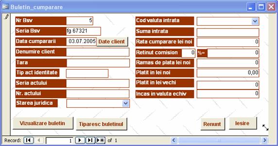 La apasarea butonului Date client din formularul Buletin-cumparare datele clientului se completeaza automat in buletinul de cumparare, fiind folosite datele utilizate la completarea formularului Clienti. Dupa completarea campurilor cod valuta si suma intrata, celelalte campuri se completeaza automat, pana la campurile platit in lei noi si platit in lei vechi care se vor completa manual de operator in functie de sumele disponibile in casa.