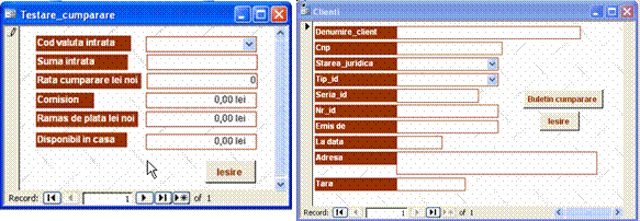 Daca se alege butonul Cumparare vor apare butoanele Disponibilitate lei si Inregistrare client. Cu butonul Disponibilitate lei care deschide formularul Testare-cumparare ce se poate vedea mai jos, se verifica daca avem suficienti lei in casa pentru a putea cumpara suma oferita de client. Putem cumpara aceasta suma atat cu lei noi cat si cu lei vechi sau daca clientul accepta, combinat o parte lei noi si o parte lei vechi. Cu butonul Inregistrare client se deschide formularul Clienti. Acest formular permite inregistrarea clientului si tot din acest formular, utilizand butonul Buletin de cumparare, vom putea edita buletinul de cumparare.