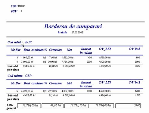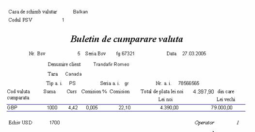 In final operatorul poate vizualiza buletinul, apoi daca mai are ceva corectii va face corectiile dorite si in final va putea tipari buletinul. Un exemplu de buletin pentru cumparare valuta poate fi vazut pe pagina urmatoare. Dupa tiparire, tranzactia se inregistreaza automat in registrul incasari-plati si tot automat se actualizeaza soldurile afectate de aceasta tranzactie.