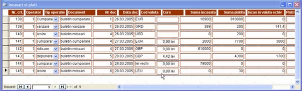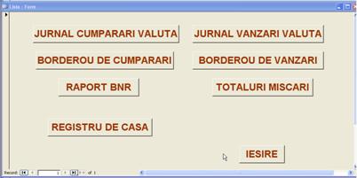 - inregistrarea automata in baza de date a sistemului a tuturor schimbarilor de curs valutar, de comisioane, a miscarilor de valuta, precum si a tuturor operatiilor de vanzare-cumparare valuta la si de la clienti;