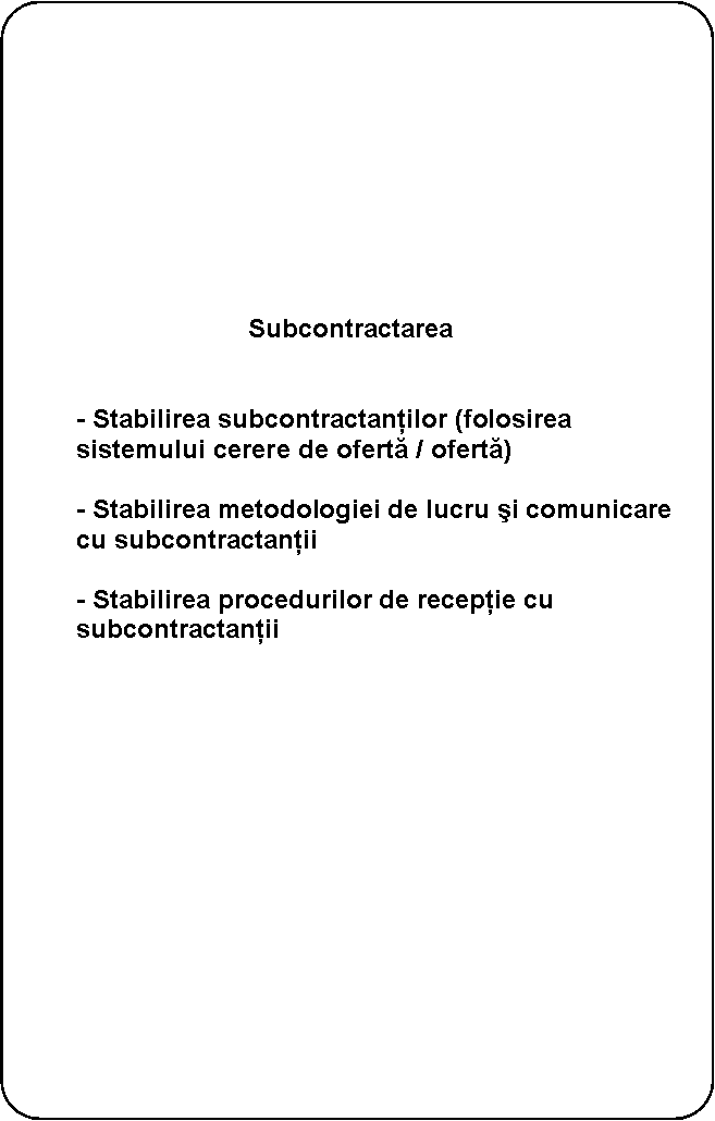- Stabilirea subcontractantilor (folosirea sistemului cerere de oferta/oferta)