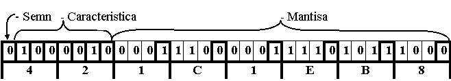 Observatia 2. In exemplul prezentat, aveam o mantisa de de biti, care ne va permite scrierea a cifre hexazecimale adica a adica si ceva cifre zecimale. Orice numar cu mai mult de 7 cifre semnificative, va fi trunchiat la acestea. Deci, in reprezentarea prezentata, nu vom putea exprima numere cu o precizie mai mare de 7 cifre.