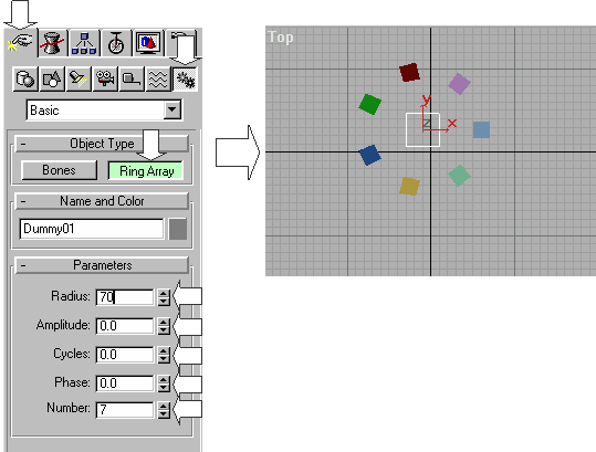 3D Studio Max permite crearea automata a unei retele circulare de prisme. Traiectoria pe care sunt dispuse prismele poate oscila in plan vertical. Pentru a realiza o astfel de retea se apasa succesiv butoanele Create, Systems, Ring Array si se introduc parametrii definitorii :