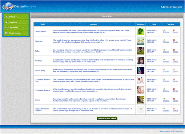 Acest modul ofera posibilitatea de a viziona, creea, edita sau sterge articole. In tabelul de mai jos se poate observa ca toate informatiile introduse de catre administrator sunt prezente. Pentru stergerea unui articol se va da click pe linkul "Sterge" iar acel articol va fi sters din baza de date prin apelarea urmatorului cod: