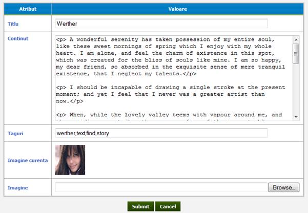 In aceasta forma se afla toate informatiile introduse de catre detinatorul site-ului. Campurile fiind: titlu, continut, taguri, imagine curenta, imagine. Administratorul poate modifica fiecare sectiune, si prin apasarea butonului "Submit" toate datele vor fi salvate in baza de date.