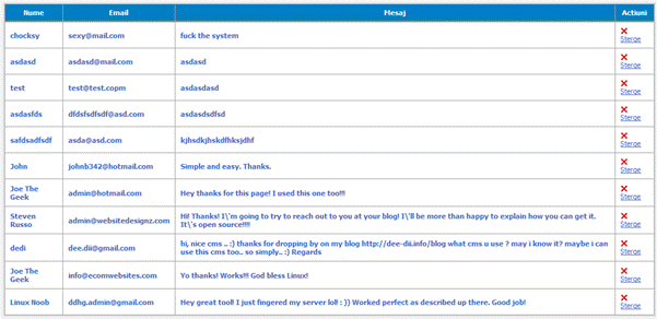 Faptul ca exista o tabela separata pentru comentarii ofera posibilitatea ca la un articol sa se adauge mai multe comentarii. Dupa ce vizitatorul adauga un comentariu la un articol acestea sunt aranjate in ordine descrescatoare in functie de campul "date" iar campul email nu apare in site deoarece acest lucru ar ajuta site-urile daunatoare sa culeaga emailuri de pe acest site.