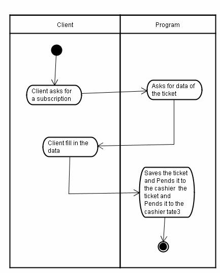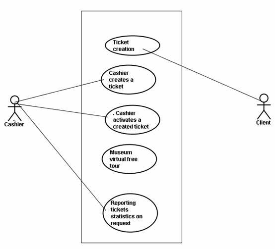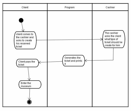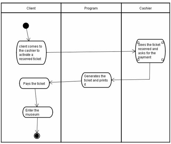 Main Actor : Cashier , Client , Program Pre-conditions : client comes to see the museum Trigger event : clients come to cashier to create the ticket or activate the created ticket Main flow of events :