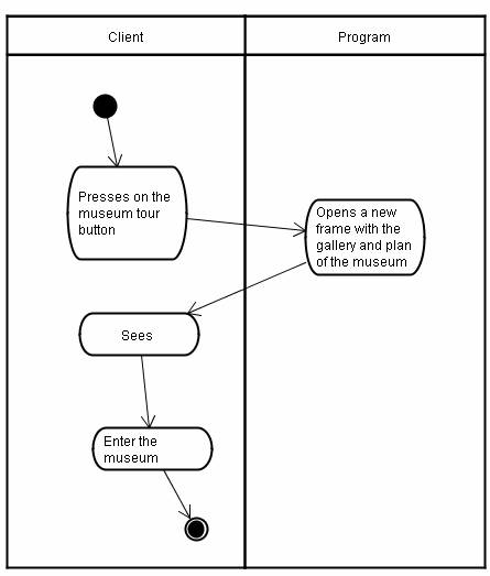 Main Actor : client , program Pre-conditions : client wants to see a plan about the museum Trigger event : client press on museum tour Main flow of events :