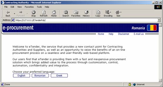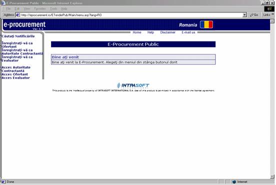Acesta este primul site pe care un utilizator trebuie sa il acceseze atunci cand doreste sa utilizeze un serviciu oferit de aplicatia E-Procurement. Pe prima pagina trebuie sa selecteze limba dorita: