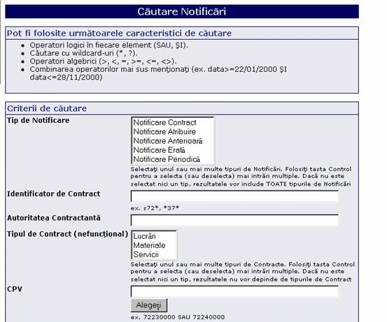 De exemplu, daca se doreste cautarea unei Autoritati Contractante al carui nume incepe cu "Int", se introduce "Int*", pe cand daca se doreste numele cu terminatia "soft", se introduce "*soft". Pentru data este uneori necesara cautarea in forma de la - pana la. Aceasta se poate realiza prin utilizarea operatorilor algebrici cu operatori logici precum SI sau SAU. De exemplu se poate cauta ">11/12/2001 SI <31/12/2001". Sau putem cauta in afara unei perioade de timp, precum "<11/12/2001 SAU >31/12/2001". Trebuie sa fiti atenti in utilizarea operatorilor algebrici si logici deoarece pot fi introduse criterii fara sens precum ">10/1/2001 SI <5/1/2001" care nu pot fi niciodata adevarate.