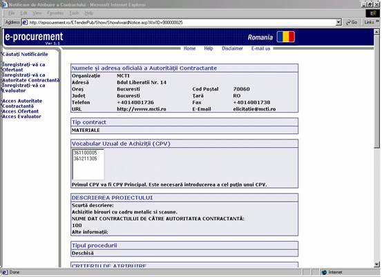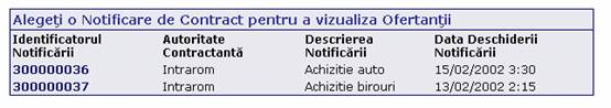 Daca apasati butonul, veti fi indrumati pentru a descarca documentele pe computerul dumneavoastra. Pentru a accesa informatiile complete pentru o notificare trebuie sa apasati numele Autoritatii Contractante, care reprezinta un link catre formularul detaliat al notificarii. Pentru notificarile de Adjudecare, notificarile Anterioare, Periodice si Erata exista un formular detaliat, in timp ce pentru notificarile de Contract exista 4 formulare detaliate, pe care le puteti accesa prin 4 butoane de la sfarsitul fiecarui formular detaliat.
