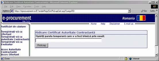 Daca ati tastat corect codul temporar vi se va solicita descarcarea Certificatului dumneavoastra prin apasarea unui link etichetat "Instalare Certificat". Dupa accesarea link-ului "Instalare Certificat" asigurati-va de instalarea Certificatului pe PC-ul dumneavoastra (consultati documentatia browser-ului in care Certificatele sunt stocate). Acum puteti accesa link-ul "Conectare Autoritate Contractanta". Pentru informatii suplimentare cititi sectiunea corespunzatoare a acestui manual.