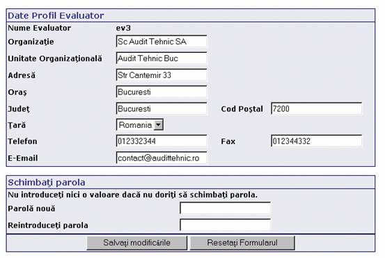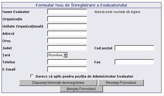 Primul formular de inregistrare este cel in care trebuie inserate datele personale. "Numele Comun al Evaluatorului" va fi utilizat ulterior ca nume de conectare (Login name). Este de preferat sa se evite utilizarea spatiilor si altor simboluri speciale.