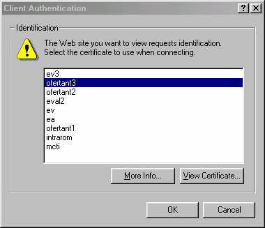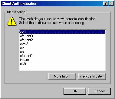 Dupa apasarea link-ului "Conectarea Ofertantului (Tenderer Login)", browser-ul va cere Certificarea pe care doriti sa o folositi pentru schimbul de informatii cu Aplicatia. Fiti atenti sa introduceti Certificarea corecta care a fost generata in timpul procesului de inregistrare. Diversele browsere au modalitati diferite de a cere Certificarea. De exemplu, mai jos sunt prezentate doua imagini, una de la Internet Explorer 5.0 si una de la Mozilla 0.9.4: