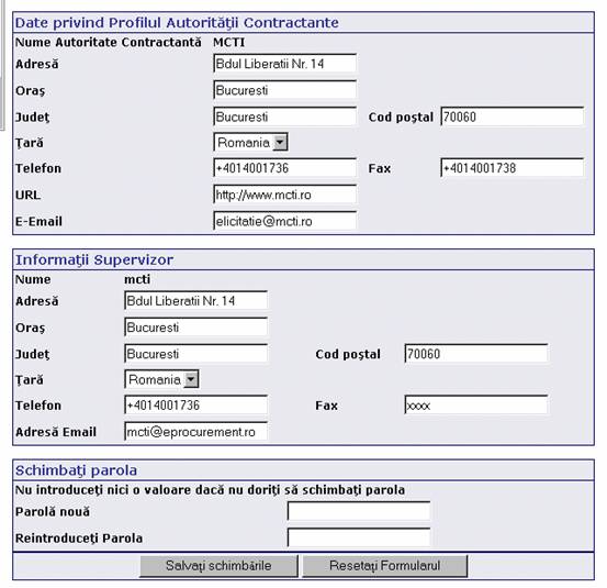 Primul lucru care va trebui sa-l faceti este sa apasati link-ul " Profilul meu (My Profile)" pentru a va modifica parola. Puteti modifica toate datele dumneavoastra, mai putin numele folosit pentru conectare (Login name) si numele Autoritatii Contractante (Contract Authority name). Pentru a va putea modifica parola, introduceti noua parola in ultimele doua campuri, apoi apasati " Salveaza modificarile (Save Changes)".