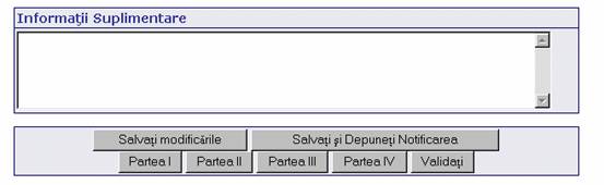 Imaginea de mai sus reprezinta un fragment din formularul de editare al notificarii anterioare. Dupa completarea formularului puteti apasa " Salvati Modificarile (Save Changes)" pentru a salva datele (iar notificarea va fi gasita in lista de notificari in asteptare) sau puteti apasa "Salvati Modificarile si Trimite" (Save Changes and Submit), ceea ce inseamna ca notificarea nu va mai fi disponibila pentru editari viitoare, iar publicul va avea acces la ea.