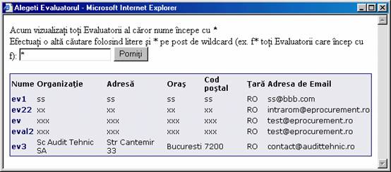 Pentru a reduce lista cu evaluatori se soloseste campul text pentru a scrie unele criterii de cautare, ex.: scrieti "ea*" , apoi apasati butonul "Go". Vor aparea evaluatorii ale caror nume incep cu "ea".