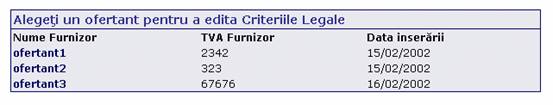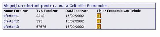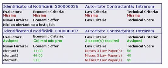 Dupa aceea, urmeaza o lista a ofertantilor cu evaluarile lor, pentru toate criteriile. Se poate observa ca nici un ofertant nu are evaluarile completate: ofertele economice nu sunt completate, Criteriile Legale lipsesc si Criteriile Tehnice nu sunt, inca, evaluate de catre evaluatorii ordinari.