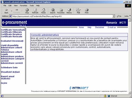 Cand va conectati ca administrator, sistemul va solicita un certificat. In acest punct trebuie sa folositi autentificarea speciala, emisa pentru administrarea E-Procurement. Exista un singur certificat si acesta este singurul care va fi acceptat pentru aplicatiile administratorului.