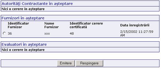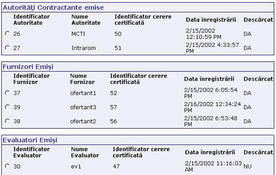 Formularul este compus din trei parti: una pentru autoritatea contractanta, una pentru solicitant si una pentru evaluatori. Puteti vizualiza certificatele emise pentru fiecare din aceste categorii. Exista o singura operatie pentru fiecare inregistrare: "Emitere" de certificate.