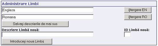 Daca doriti adaugarea unei noi limbi, scrieti in "Noua limba" limba dorita si identificatorulul limbii in "Identificatorul noii limbi" . Identificatorul limbii este unic pentru fiecare in parte.