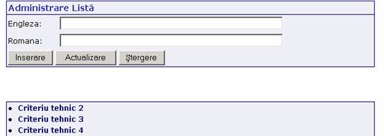 De aici se pot administra Criteriile Tehnice. Accesand o descriere din cadrul de jos se pot completa valorile din cadrul de sus. Acolo se pot edita criteriile si apoi accesati "Actualizare", pentru a le salva, sau "Stergeti", pentru a sterge complet inregistrarea respectiva.