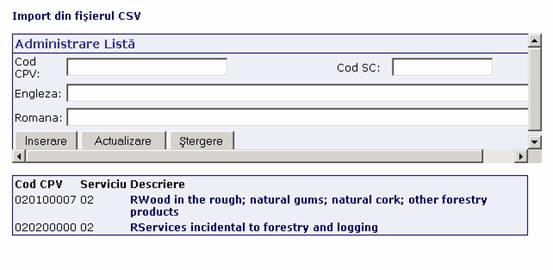 De aici se pot administra codurile CPV. La inceput trebuie sa selectati o categorie pentru a vizualiza inregistrarile.