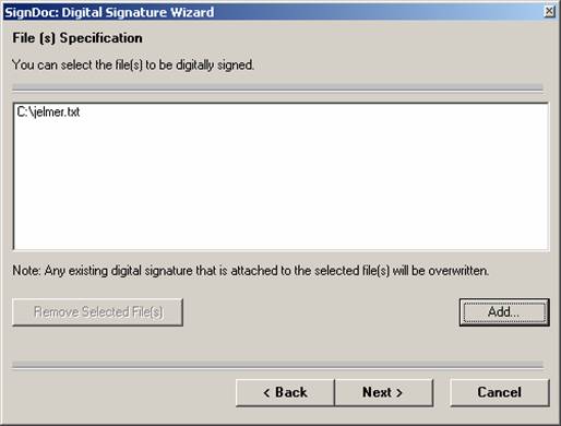 Apasati butonul "Continuati" pentru a trece la al doilea ecran, unde trebuie adaugate fisierele. Apasati butonul "Adaugati" pentru adaugarea fisierelor. Utilizati butoanele "Inapoi", "Continuati" pentru miscarea inainte sau inapoi a indrumatorului. Apasati butonul "Anulati" pentru a parasi SignDoc.