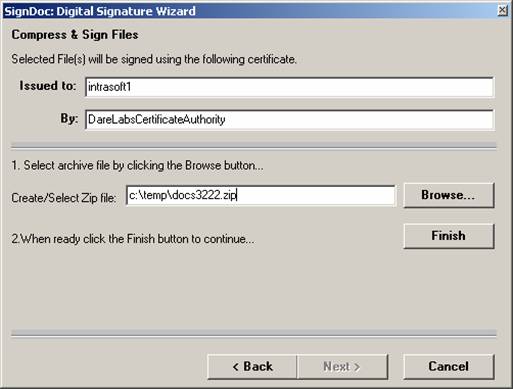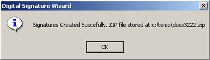 Utilizati butonul "Cautati" pentru selectarea locatiei si numelui fisierului ZIP care va fi creat. Apasati butonul "Incheiati" pentru a crea fisierul ZIP continand fisierele dumneavoastra precum si pe cel cu semnatura digitala corespunzatoare.