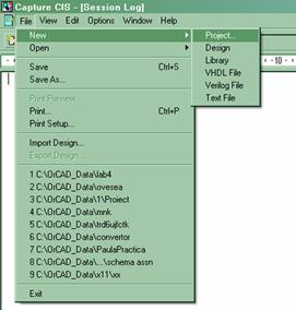 In cazul editarii unei scheme este necesar pornirea aplicatiei Capture CIS si creerea unui nou proiect (Meniul File se selecteaza New cu optiunea Project) Figura 1.