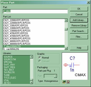 Incarcarea librariilor se face prin selectarea butonului Add Libray si de la locatia: C:OrCadtoolscapturelibraryPSpice se selecteaza toate bibliotecile (ctrl+a) si se incarca. Aceste biblioteci vor fi vizibile in lista Libraries din stanga jos a ferestrei. Componentele continute in aceste biblioteci se gasesc in lista din centrul ferestrei intitulata Part List.