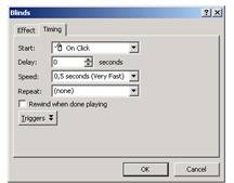 prinactionarea butonului Timing se deschide o fereastra care permite stabilirea intervalelor de timp in derularea animatiilor