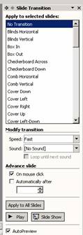 Ø din meniul Slide Show se executa comanda Slide Transition.