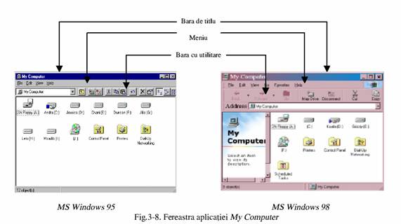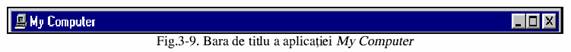 Bara de titlu, cu numele aplicatiei si butoanele de control. In exercitiul de mai sus a fost deschisa aplicatia My Computer, a carei denumire este afisata in bara aflata in partea superioara a ferestrei: