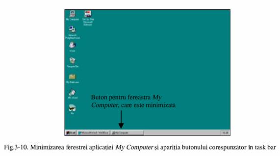 Exercitiu 3-6: Cu un click cu butonul din stanga al mouse-ului minimizati fereastra intitulata My Computer. Veti observa cum ea dispare de pe ecran si cum in bara de task-uri apare un nou buton cu denumirea My Computer