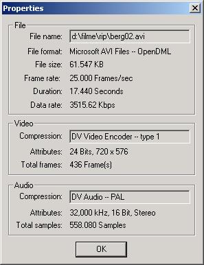 Daca din meniul Ulead vei da View->Playback (de fapt implicit dupa ce ai intrerupt captura se face play la ceea ce ai capturat) si apoi File->Properties va apare urmatoarea ferestra unde poti vedea proprietatile secventei capturate: