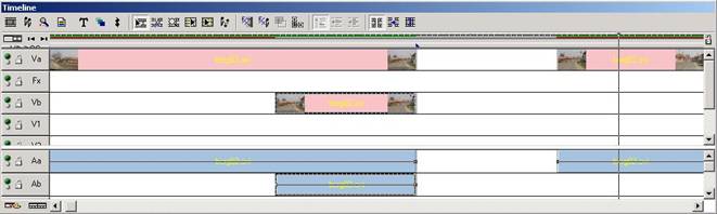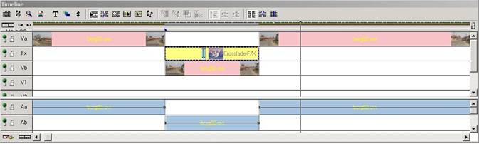 Aici e putin mai complicat. Pentru a intelege cum se face o tranzitie trebuie sa stii ca in final cadrele din linia (fluxul video) Vb au precedenta fata de cadrele din linia Va. Acest lucru de poate verifica imedia copiand spre exemplu o bucata din Va in Vb (cu Time Selection faci selectia, apoi CTRL+C, apoi schimbi pe Clip Selection si apesi CTRL+V ducand mouse-ul pe Vb in locul in care vrei sa copiezi bucata respectiva) si facand un play in fereastra de preview. Vei vedea ca in momentul in care cursorul a ajuns in portiunea in care exista flux video Vb, fluxul video Va este ignorat. Acum ca ai inteles acest lucru trebuie sa mai precizez ca toate efectele speciale de tipul Transition Effect (vezi fereastra Production Library) se insereaza in linia Fx.